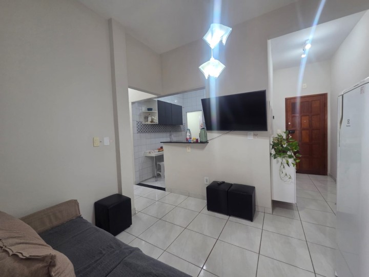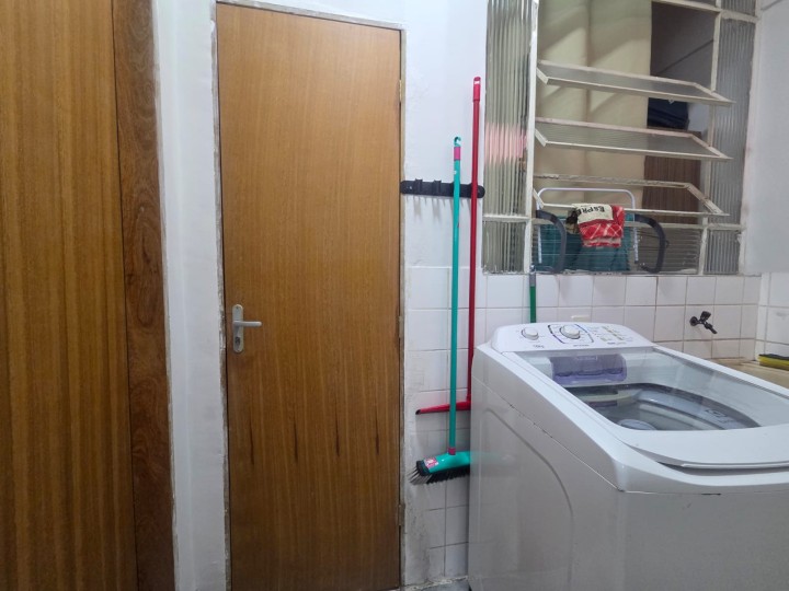 Apartamento amplo e equipado: com cozinha, banheiros e área de serviço compartilhados.